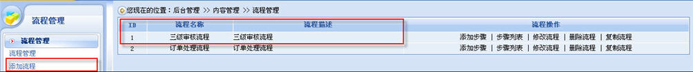 添加完稿件状态后,我们就可以开始为稿件添加工作流程了,操作步骤为:登录系统后台——内容管理——内容模型管理——流程管理。这里,我们添加的是一个三级审核流程。