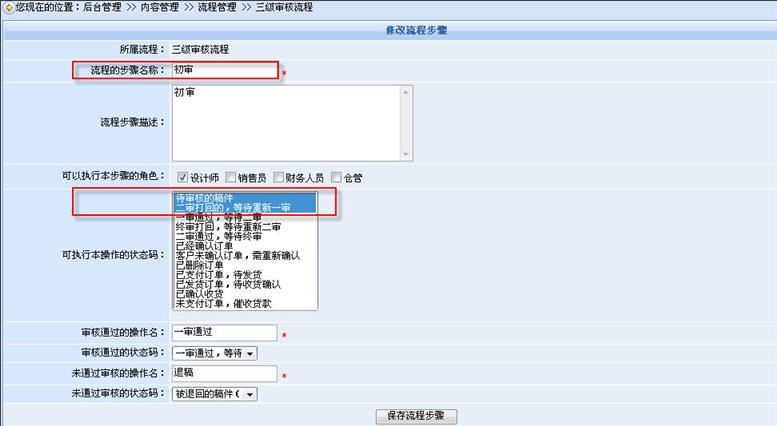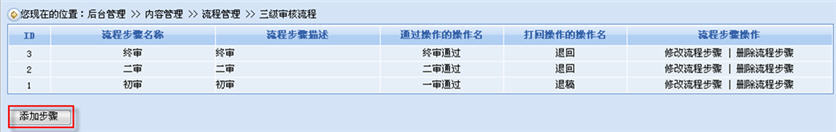 在添加步骤的页面里,我们根据所设计的三级审核流程来指定该步骤的各种参数,如:步骤名称、可执行本步骤的角色、哪种状态的稿件可以执行本步骤的操作、通过(不通过)该步骤的操作的命名、通过(不通过)该步骤的稿件状态等。