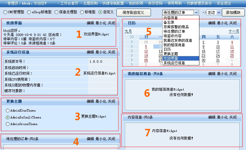 下图为系统默认“我的工作台”中显示的widget,图中红框标注1、2、3、4、5、6、7的位置,显示的就是一个个独立的widget模块,可以通过拖拽、关闭和编辑排列他们的位置或者显示的内容。