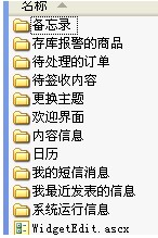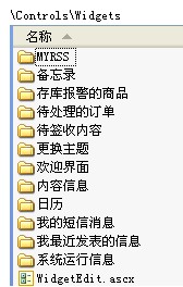 Widget(中文名:微巨)简单的说是一个功能应用的开放式平台,它的应用包括:桌面Widget (Yahoo! Widget、鱼鱼桌面秀等)、个性化首页Widget(igoogle)、博客Widgets(抓虾RSS、博客侧边栏等)。Widget 的优点是“软件模块化”和“易扩展性”便于个性化界面;在SiteFactory™ CMS 2.0 中可以为“我的工作台”添加各种基于系统或者系统外的功能应用,如:待处理订单、欢迎界面、主题更换、订阅RSS等。目前系统已经预设了11种widget模块,且后台的所有widget模块都可以在 Controls\Widgets 目录下找到,如图: