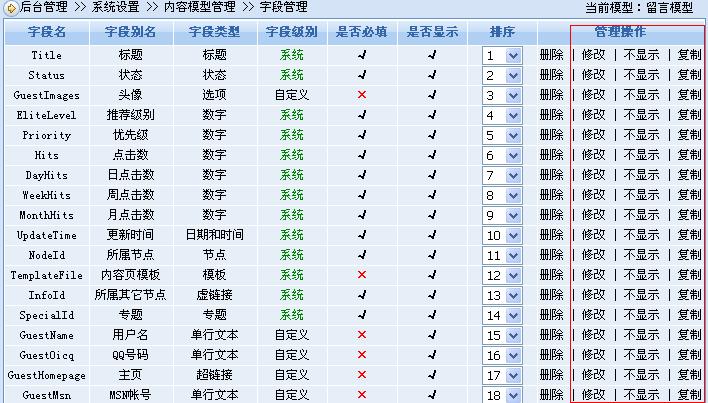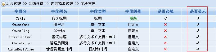 一是增加了一个“显示/不显示”的功能代替“启用/禁用”功能,这样做是为了帮助用户对不需要显示的系统字段进行隐藏,或者对暂时不需要的字段进行隐藏。隐藏后的字段将不会在前台和后台显示出来。