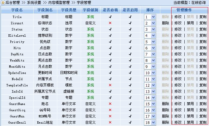 二是改良后的留言模型能够自由增删字段,制作成各种提交表单模型。如下图是简单制作的“在线咨询模型”: