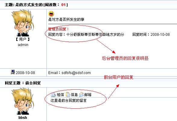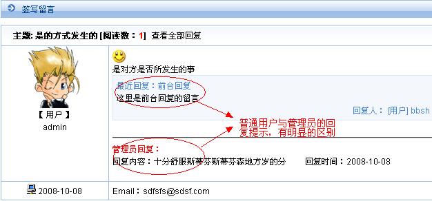 在SiteFactory™ 1.0 版本中,管理员对留言的回复默认前台是看不见的,只有自己手动在模板中调用相关标签才能够实现。SiteFactory™ 2.0 版本中,新版本对这个问题进行了修改,除了让管理员的回复默认能够显示以外,还对管理员的回复进行了特别的提示处理,如下图: