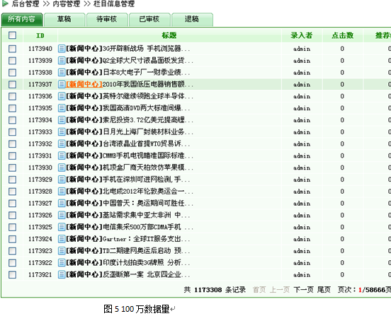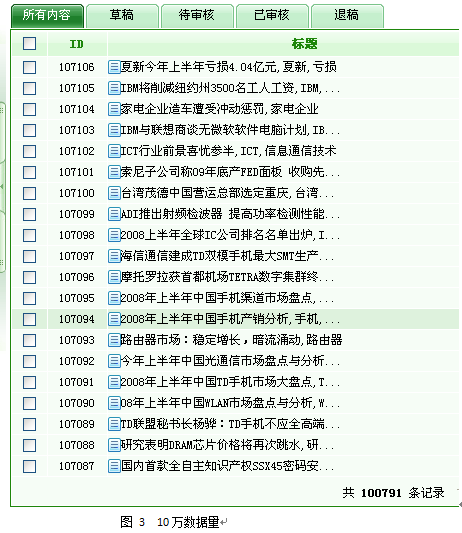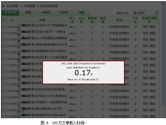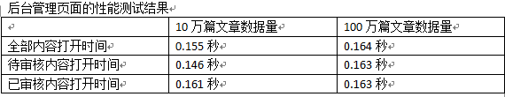 小结:动易SiteFactory的后台管理可以轻松承载100万的数据,并且和10万数据时相比,没有任何性能上的衰减。无论是10万数据还是100万数据,后台管理的几个主要页面的打开时间都在0.2秒以内,可以说是“闪电”来形容,绝对是“飞快”的级别。