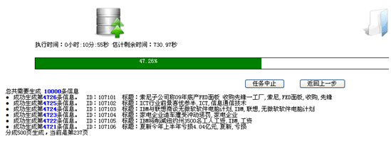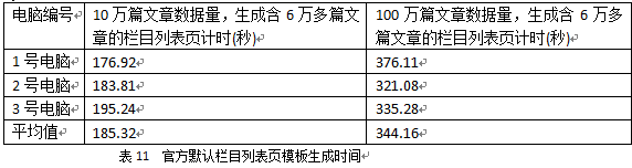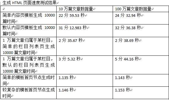小结:动易SiteFactory2.0的栏目页的生成速度可以说用“飞快”来形容。无论是10万数据还是100万数据,使用简单模板的情况下,生成一个含有6万多篇文章(每页20篇文章,共要生成3000多个页面)的栏目页的生成时间都在150秒左右,约每秒种生成20页,性能上没有太大的差异。