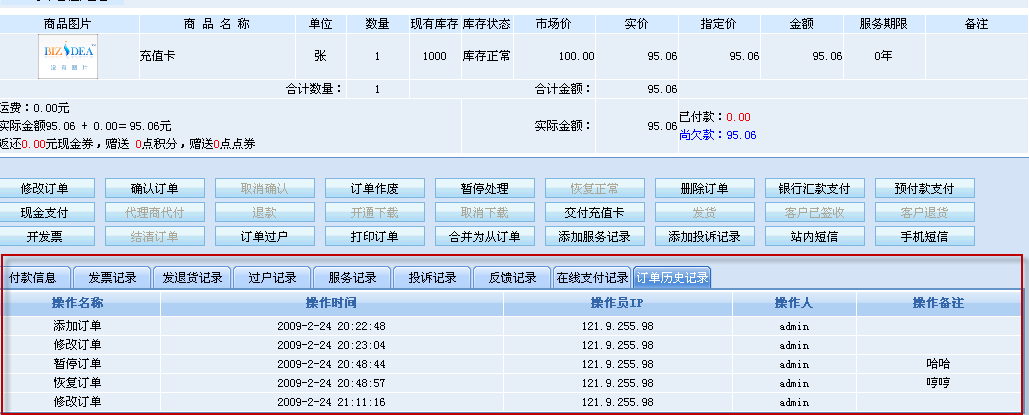 针对于此,动易BizIdea 2.5版设计了“订单历史记录”功能,对“从下订单到订单确认、修改订单、删除订单、订单作废/恢复正常、支付订单”等等所有订单操作,系统均进行详细的记录。(图1)