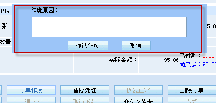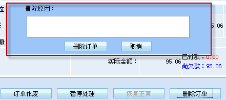 此外,对于订单作废、订单暂停处理\恢复正常、删除订单等在订单处理过程中的关键操作步骤,在执行操作前还必须录入操作原因,如作废原因、暂停处理原因、删除订单原因等,以进一步确保该订单得到安全妥善的处理。(图2、3)