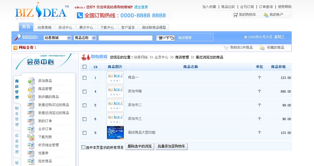 为了提高会员购物体验,BizIdea2.5版系统在前台会员中心新增了“我最近浏览过的商品”功能,可以对前台会员所有的商品浏览历史进行记录。会员可以在会员中心中查看自己曾浏览商品的名称、单位及价格信息,也可直接将商品从列表中删除或批量添加至购物车。(如图)