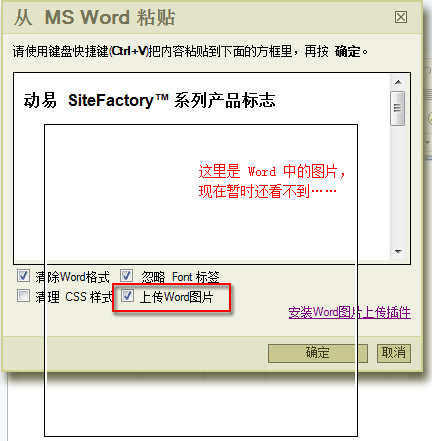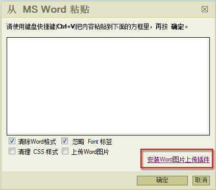三、插件安装成功后,在“从 MS Word 粘贴”弹出窗口中,将 Word 中的内容复制并粘贴(Ctrl+V)到窗口中(当然 Word 中的内容应该有图片哩^_^)。要注意勾选窗口中的“上传 Word 图片”选项:
