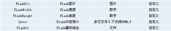 在Flash模型中新增的字段有Flash图片、Flash宽度、Flash高度、Flash内容简介、Flash播放地址等,站长可以利用这些字段来设置Flash文件的首页图片、内容简介、播放地址、宽高度等等,可以满足普通Flash模块构建的需求。如果还需要做其他更多个性化效果或者设置的话,那就需要大家多动动脑筋动动指头自力更生了哦(*^__^*)