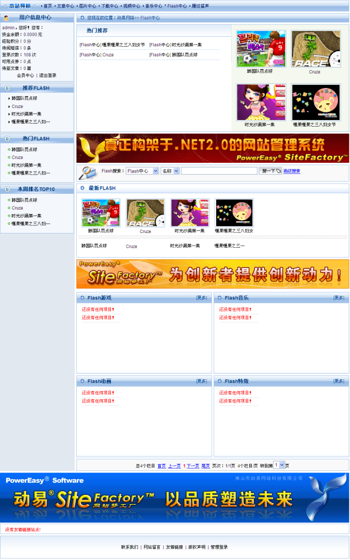 前面已经给大家介绍了SiteFactory2.5版系列预置内容模型里的音乐模型和视频模型,今天要给大家介绍的是系列预置模型里面的最后一个:Flash模型,相信有不少网友也已经对这个模型期盼已久了,那废话不多说,我们赶紧来看看吧。