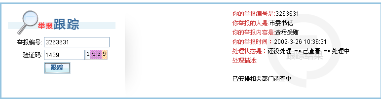公众在前台可以输入举报编号来实时查询到所举报事件的处理情况和处理结果。