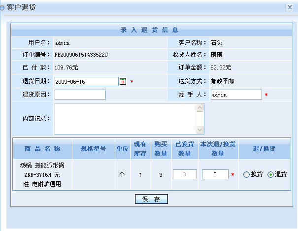 如顾客需要对订单中部分商品进行退货或换货时,则商家可在收到退回商品后在录入退货信息页面详细记录顾客退回的各商品数量,同时退货后订单的金额也将相应减少。如果是换货则商家可以重新给客户发货。