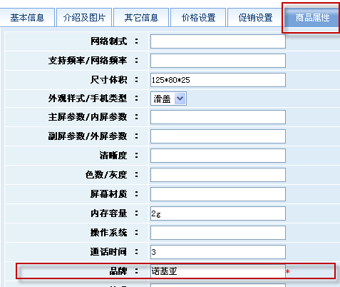 然后在节点设置中配置好相应的栏目模板,最后再来在相应的商品模型下添加商品,在商品属性下新增的“品牌”字段后填写相应的手机品牌: