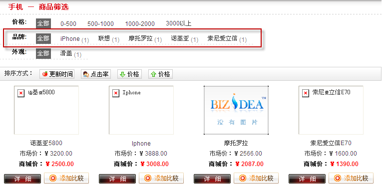 看看以上两幅图中的红色框框部分,怎么样,是不是恍然大悟啊?我们去不少大型B2C网站的时候应该都使用过这个方便的筛选功能吧?之前也有一些用户在论坛上提交过这个功能的开发建议。在BizIdea™ 3.0中,大家就可以亲自体验到这个商品多属性筛选功能了。那今天,我们就先来一睹为快吧!