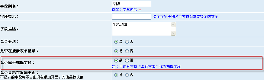 首先我们在手机商品模型中添加一个“品牌”字段,在选项中勾选添加前台筛选:
