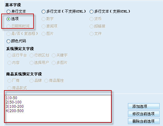 最后还要跟大家介绍一下的就是,除了单行文本、多行文本这两种基本的字段类型外,系统还特别新增了“选项”字段类型,以丰富字段类型,增强筛选列表的扩展性;同时,新的“选项”字段类型还可以让管理员在后台的操作更为便捷。