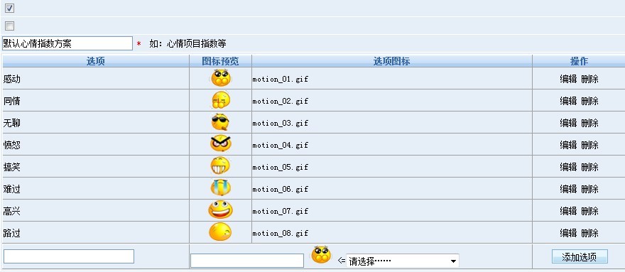 现在,在SiteFactory3.0版本中,大家就可以在自己网站上使用上这个心情指数功能啦!用户可以在后台心情指数管理中任意添加多套不同的心情指数,以备前台轮换使用。而且,为了让用户可以实现开箱即用,系统已预先内置了一套心情指数方案: