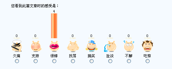 很熟悉吧,我们在不少网站都看到过这样的功能了,浏览完新闻后随手点击下以发表自己对该新闻的心情和情绪,各种可爱的卡通心情图标,相信很多浏览者都会乐于随手点击一下的。而对于网站来说,心情指数的功能无疑为时下非常有效的一种增进用户与网站互动的良好方式,相比起需要用户经过思考并书写发表评论这种传统的互动方式来说,心情指数功能可以让用户更直接、简单而快捷地抒发自己的阅读心情,而夸张又搞笑的各种心情代表卡通头像更是吸引着用户因为好玩而参与到网站互动中来。
