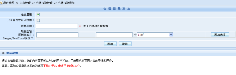 如果用户需要另外使用新的心情图标的话,则可以自行进行添加,只需将相关的表情文件包放至系统文件的Images/MoodIcon/目录下,然后到相关的模板文件进行简单修改即可,非常简单。