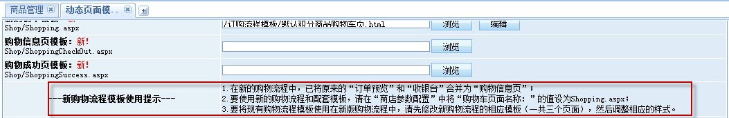 而升级用户如果需要把原有的购物流程模板挪用到新的购物流程中,则还需要在后台修改相应的模板样式,并且修改过程有详细的提示文字:
