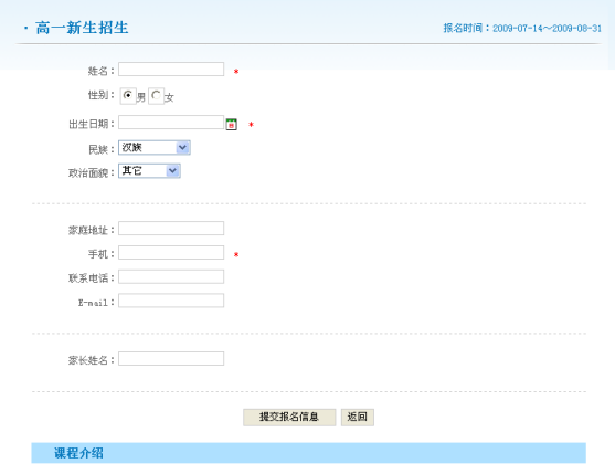 利用招生管理功能,学校可以实现新生入学招生、校内各类兴趣班\培训班招生等等,尤其是对于如今社会上琳琅众多的各类培训机构和学校来说,这个功能便尤为实用。学生可以在学校网站上浏览学校开设的各种课程,选定后便可直接在线报名,而不用亲自跑到学校去报名,非常方便;而学校在网站后台也可以对各种不同培训课程的学生报名情况进行分别管理,让工作人员的工作变得简单而高效,而且还大大节省了人力成本。