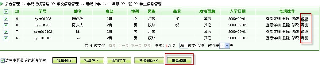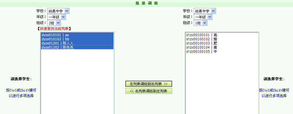 在学校中,学生可能会因为多种情况而需要调班或者转班,为了切合这一实际需求,3.0学校版新增了给学生调班的功能,可以将学生相关信息从当前班级转到其他班级。此外,系统还提供了批量调班的功能,可以便捷地实现多个学生的一次性调班操作。