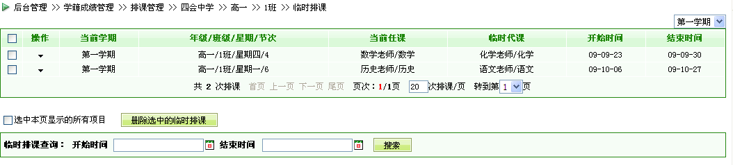 动易SiteFactory学校版后台提供了对所有班级的课程表进行人工排课的功能,免去了学校工作人员纸质排课的大量工作量;而在学校中可能经常会出现的由于各种原因需要临时调课的现象(如任课老师因事/因病请假需要其他老师临时代课或调换其他科目等),如果不能及时修改课程表,将会对老师和学生的正常上课造成影响。针对这一现象,系统又特别新增了临时排课的功能,管理员可以对课程表中的某个节次课程进行临时调课,以更好地切合学校用户的实际使用需求。