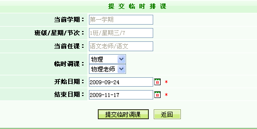在后台某个班级的课程表中,我们可以点击所需要进行调课的节次进行临时排课: