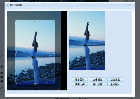 从截图上我们可以看到,在图片裁剪的操作界面系统还提供了全透明化、白色背景、是否使用比例等系列功能,可以非常方便地对图片进行剪裁编辑。裁剪完毕后,直接点击“生成图片”即可自动保存裁剪结果。