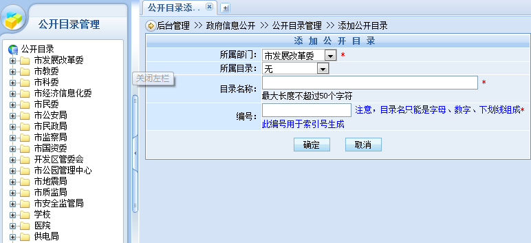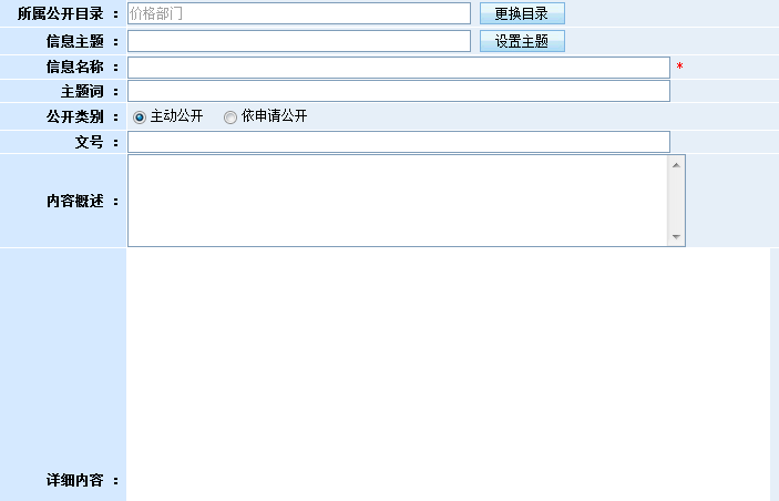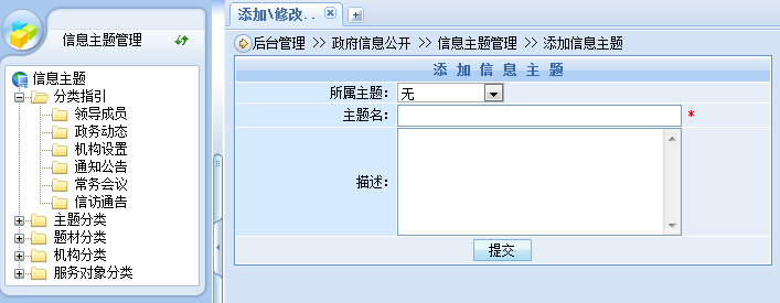 用户可以直接添加公开信息的主题、名称、文号、公开类别、概述等。