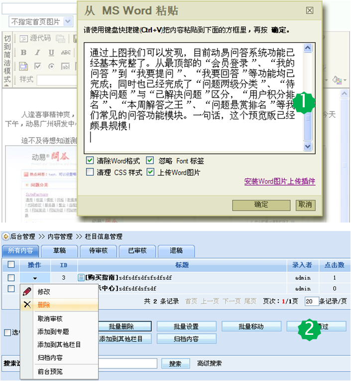 各部门信息采编人员通过手工或者自动的方式将信息入库。“手工入库”支持人工信息编辑(图文混排、word文字排版、word图片自动上传等),且为用户提供“所见即所得”的内容编辑器;“自动入库”支持网站信息自动采集或Excel文档导入,极大降低用户的维护工作量。