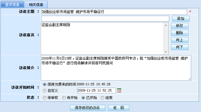 当需要创建新一期的在线访谈节目时,用户简单录入访谈主题、嘉宾、简介、开始时间、摘要、背景资料等信息后,便可快速创建起新的访谈节目。