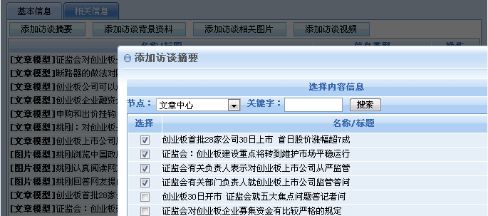 前台展示界面提供了丰富的内容展示元素,包括:访谈预告(主题、时间、嘉宾等)、访谈摘要、背景资料、访谈详细内容等;同时,在访谈结束之后,可以对访谈的内容进行图片编辑、视频编辑等。