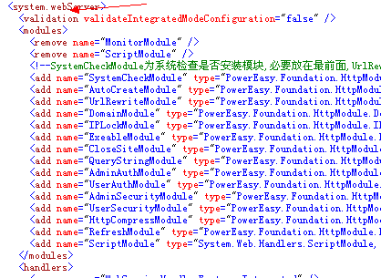 根据IIS 7的新情况,兼容IIS6等,对Web.config进行了重新配置,主要是对HTTP Module和Handler 进行了重新调整。