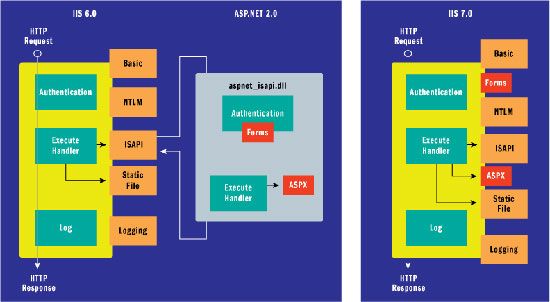 IIS 7 完全整合 .NET 之后,架构的处理顺序有了很大的不同(如下图),最主要的原因就是 ASP.NET 从 IIS 插件(ISAPI extension)的角色,进入了 IIS 核心,而且也能以 ASP.NET 模块负责处理 IIS 7 的诸多类型要求。这些 ASP.NET 模块不只能处理 ASP.NET 网页程序,也能处理其他如 ASP 程序、PHP 程序或静态 HTML 网页,也因为 ASP.NET 的诸多功能已经成为 IIS 7 的一部份,因此 ASP 程序、PHP 程序或静态 HTML 网页等类型的要求,也能使用像是Forms认证(Forms Authentication)或输出缓存(Output Cache)等 ASP.NET 2.0 的功能(但须修改 IIS 7 的设定值)。也因为 IIS 7 允许自行以 ASP.NET API 开发并加入模块,因此 ASP.NET 网页开发人员将更容易扩充 IIS 7 和网站应用程序的功能,甚至能自行以 .NET 编写管理 IIS 7 的程序(例如以程控 IIS 7 以建置网站或虚拟目录)