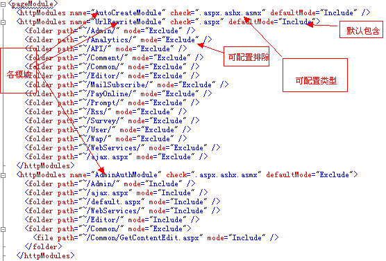 IIS 7 完全整合 .NET 之后,这些 ASP.NET 模块不只能处理 ASP.NET 网页程序,也能处理其他如 ASP 程序、PHP 程序或静态 HTML 网页,也因为 ASP.NET 的诸多功能已经成为 IIS 7 的一部份,因此 ASP 程序、PHP 程序或静态 HTML 网页等类型的要求,也能使用像是Forms认证(Forms Authentication)或输出缓存(Output Cache)等。因此,默认情况下HTTP Module需要处理更多没有必须的工作。如css、jpg、gif、html等某些不需要HTTPModule检查的请求会浪费系统很多没有必要的性能。为了解决这个问题,我们对HTTPModule模块化和可配置等改进。重新合理调整HTTPModule的功能模块,使其各施其职。HTTPModule的可配置化,可以随时根据不同的需求进行调进。
