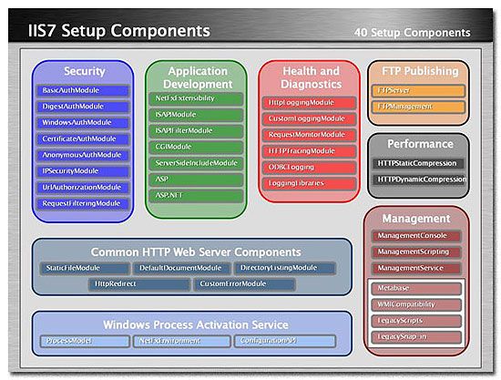 在IIS7中,.NET应用程序直接通过IIS代码运行而不再发送到Internet Server API扩展上,这样就减少了可能存在的风险,并且提升了性能,同时管理工具内置对ASP.NET 3.0的成员和角色管理系统提供管理界面的支持。这意味着用户可以在管理工具里,创建和管理角色和用户,以及给用户指定角色,下面是IIS 7 完整的组件分报图。