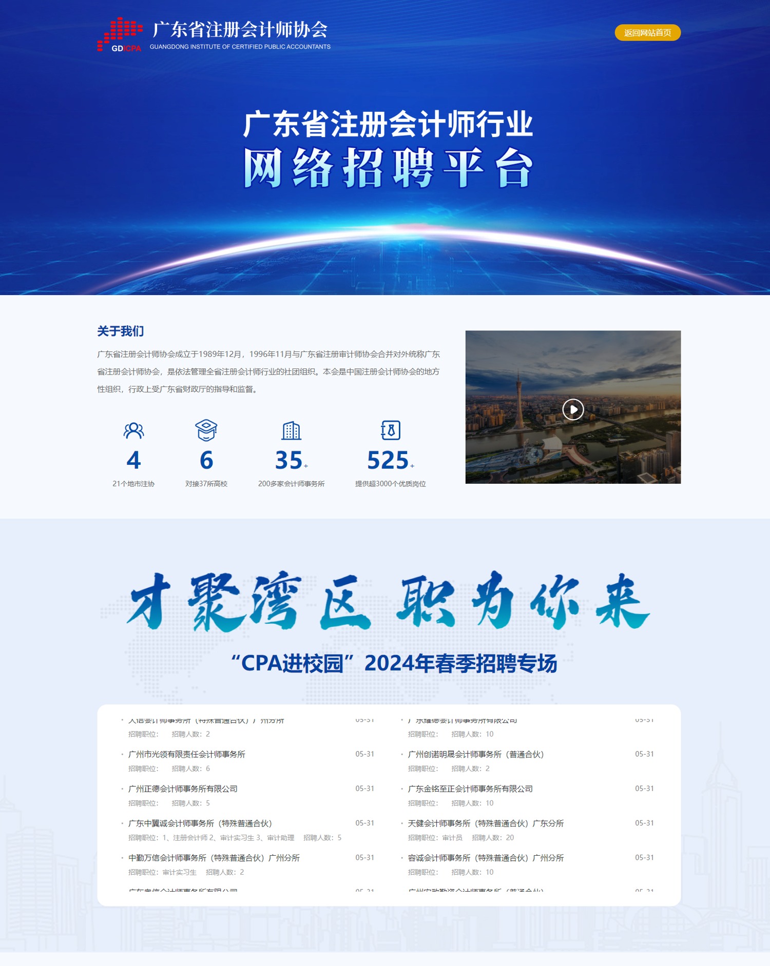广东省注册会计师行业网络招聘平台是联合全省21个地市注协搭建的“一站式”垂直招聘平台,专注于注册会计师行业的招聘,服务全省近1100家会计师事务所,为全国大学毕业生提供注册会计师行业的招聘信息,实现精准匹配。